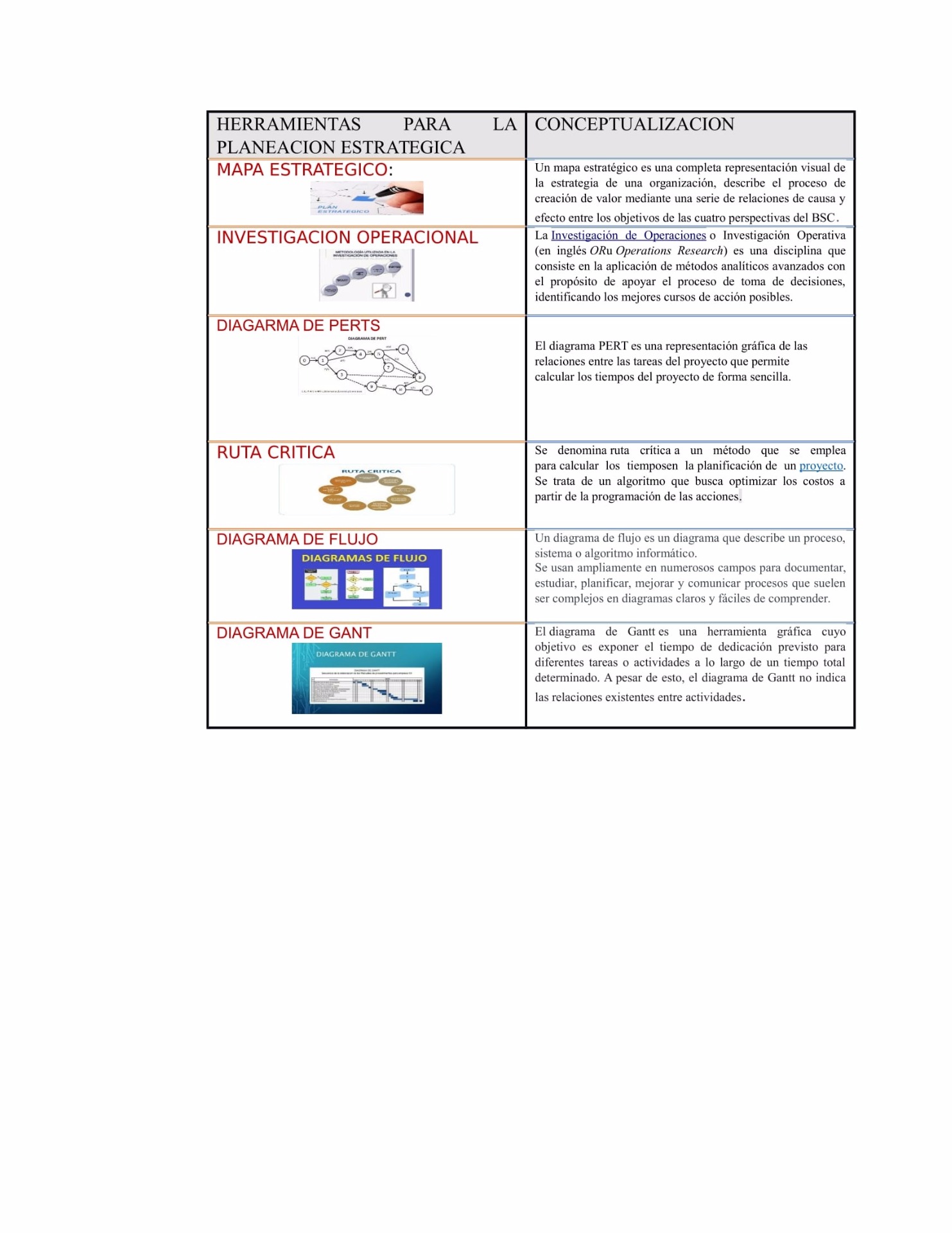 estratégicos, diagramas de Gantt y de flujo, investigación operacional, el